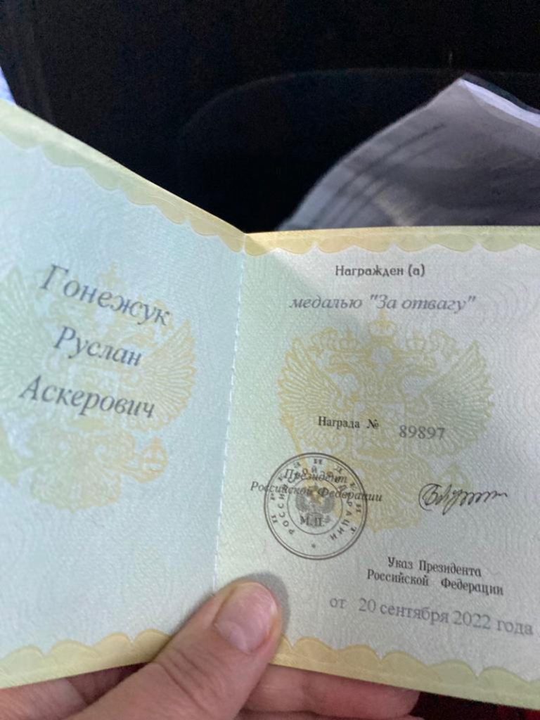ХэушъхьафыкIыгъэ дзэ операцием Руслъан зыщыIэ мафэ горэм кIэлэ купэу зыхэтыр топхэмкIэ къызэорэ чIыпIэм итхэу хъугъэ. Зэрысыгъэхэ унэм зыкъыщызыштэгъэ мэшIошхом къыхэмыкIыжьышъущтыгъэ нэбгырэ пчъагъэ Руслъан къырихыжьыгъ. Ежь уIэгъэ ыкIи шъобж хьылъэхэр тещагъэхэу мэзэ пчъагъэрэ госпиталым щеIэзагъэх. КIэлэ ныбжьыкIэм псэемыблэжь зекIуакIэу къыхэфагъэм фэшI орденэу «За Отвагу» зыфиIорэр къыфагъэшъошагъ.