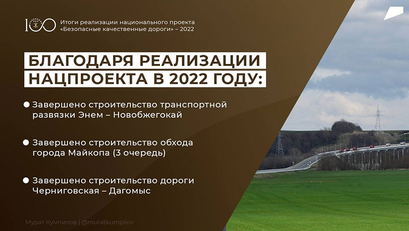 — Мы лъэпкъ проектым ишIуагъэкIэ тигъогу системэ зэхъокIыныгъэшIухэр зэрэфэхъухэрэр нэрылъэгъу. 2022-рэ илъэсэу Адыгеим къэралыгъо гъэпсыкIэ зиIэр илъэси 100 зыщыхъугъэм анахь мэхьэнэ ин зиIэ псэуалъэхэм ащыщыр, Мыекъуапэ къэзыухьэрэ гъогоу километрэ 27-рэ хъурэр, тыухи ттIупщыгъ, — къыритхагъ АР-м и ЛIышъхьэу КъумпIыл Мурат иинтернет нэкIубгъохэм ащыщ.