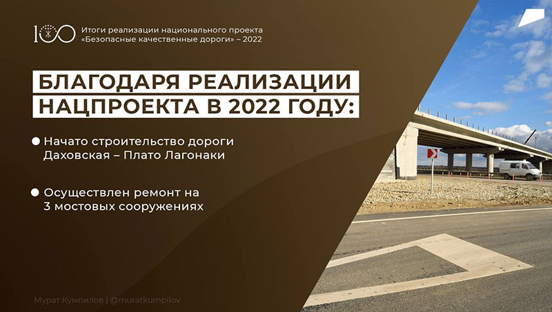 Проектым къыщыдэлъытэгъэ ахъщэмкIэ 2022-рэ илъэсым рагъэжьагъ Мыекъопэ районым истаницэу Дахъом икIэу бгы тешъоу Лэгъо-Накъэ кIорэ гъогури. Ащ нэмыкIэу лъэмыджищ республикэм щыгъэцэкIэжьыгъэ хъугъэ.