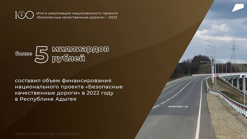 Ащ ипсалъэ къызэрэщыхигъэщыгъэмкIэ, «Щынэгъончъэ ыкIи шэпхъэшIухэм адиштэрэ гъогухэр» зыфиIорэ лъэпкъ проектым къызэрэщыдэлъытагъэу икIыгъэ илъэсым Адыгеим щызэшIуахыгъэ IофшIэнхэм пстэумкIи сомэ миллиарди 5 апэIухьагъ. АщкIэ республикэм иавтомобиль гъогу Iахь 49-рэ, ар километрэ 300 зэрэхъурэр, агъэцэкIэжьыгъ е икIэрыкIэу ашIыжьыгъ, гъогурыкIоным лъыплъэнхэу камерэ 18 агъэуцугъ.