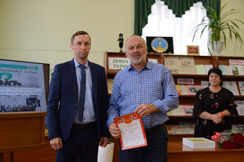 Партиеу «Единэ Россием» АР-мкIэ икъутамэ игъэцэкIэкIо комитет ипащэу АфэшIэгъо Рэмэзан журналист чанэу, общественнэ IофышIэу Тхьаркъохъо Адам Щытхъу тхылъ къыритыгъ. Урысыем щыпсэурэ лъэпкъ зэфэшъхьафыбэм абзэ ухъумэгъэныр ыкIи хэгъэхъогъэн фаеу УФ-м и Президентэу В. Путиным зэрэкIигъэтхъырэм зэрэдыри— гъаштэрэр ащ къыIуагъ, гъэзетэу «Адыгэ макъэм» нэмыкI пстэоу къэгущыIагъэхэм афэдэу, гъэхъагъэхэмкIэ къыфэлъэIуагъ.