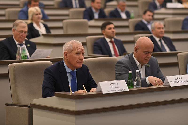 Ащ хэлэжьагъэх АР-м и ЛIышъхьэу КъумпIыл Мурат, министрэхэм я Кабинет хэтхэр, федеральнэ ыкIи шъолъыр къулыкъухэм япащэхэр, нэмыкIхэр. Зэхэсыгъор зэрищагъ Парламентым и Тхьаматэу Владимир Нарожнэм.