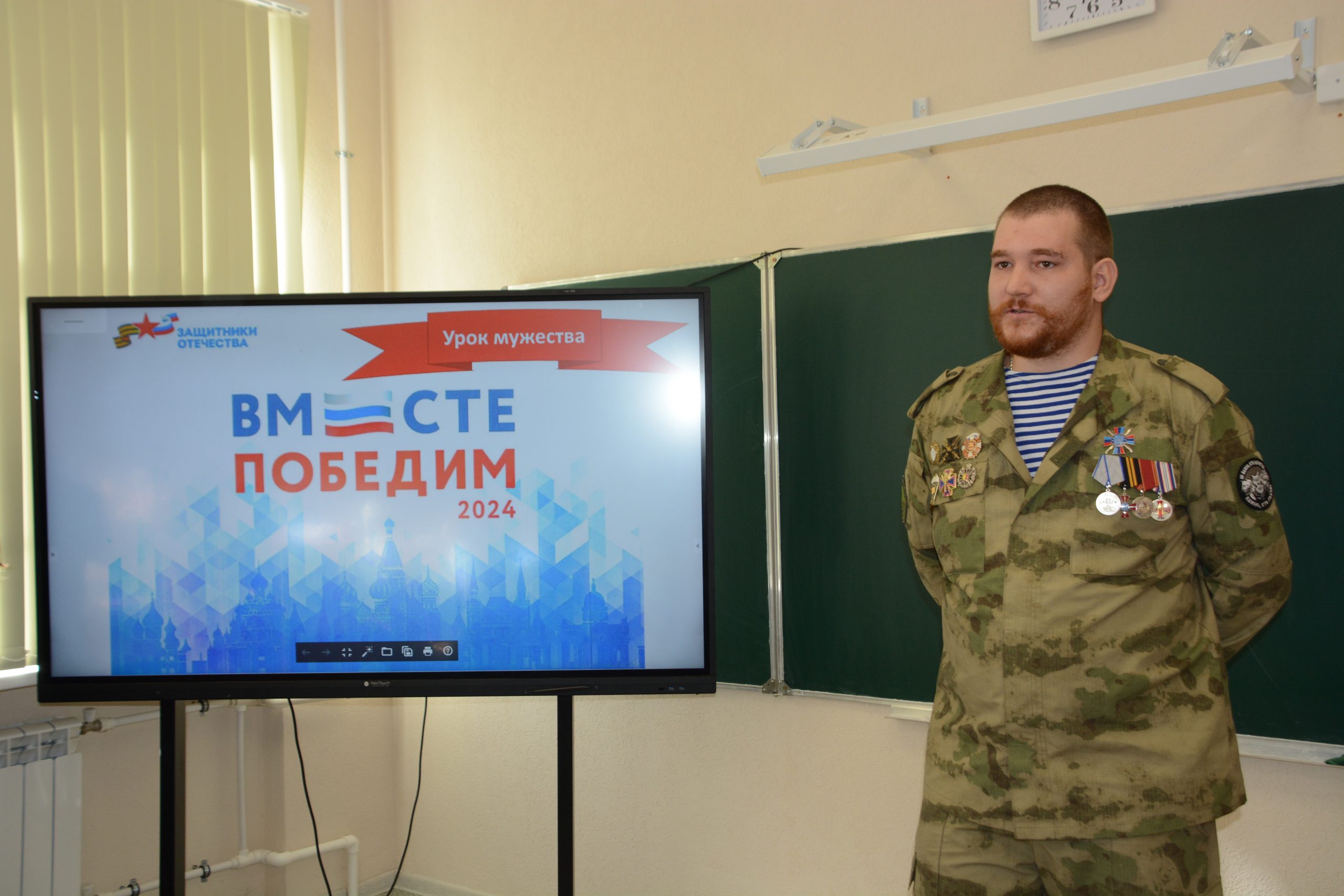 Мы еджапIэм ия 10-рэ классхэм арыс ныбжьыкIэхэм аIукIагъ хэушъхьафыкIыгъэ дзэ операцием иветеранэу, Адыгэ республикэ общественнэ организациеу «ХэушъхьафыкIыгъэ дзэ операцием иветеранхэм я Ассоциацие» зыфиIорэм итхьамэтэгъоу, медалэу «За отвагу» зыфиIорэр къызфагъэшъошагъэу Илья Донцовыр.