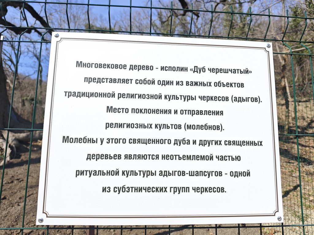 Специалистхэм яшIошIкIэ, агуе чъыгаем, зэфэшъхьафэу къызэралъытэрэмкIэ, илъэс 500-м къыщегъэжьагъэу 780-м нэс ыныбжьыщт. Иныжъым илъэгагъэ фэдиз — метрэ 20, шъхьапэр метрэ 40 мэхъу. IофшIэнэу агъэцакIэрэм къыдыхэлъытагъэу дендрологхэм чъыг гъурбыр аукъэбзыгъ ыкIи хъагъэхэмкIэ зэфашIыгъ, хьацIэ-пIацIэхэм амышхыным пае уцхэр щафагъ, чъыг лъапсэм дэжь чIыгъэшIухэр халъхьагъэх… Чъыгым ихъурэягъэкIэ къашIыхьагъ, еплъынэу къыIухьэхэрэр благъэу емыкIолIэнхэм ыкIи ащ ылъапсэхэр амыутэнхэм афэшI.