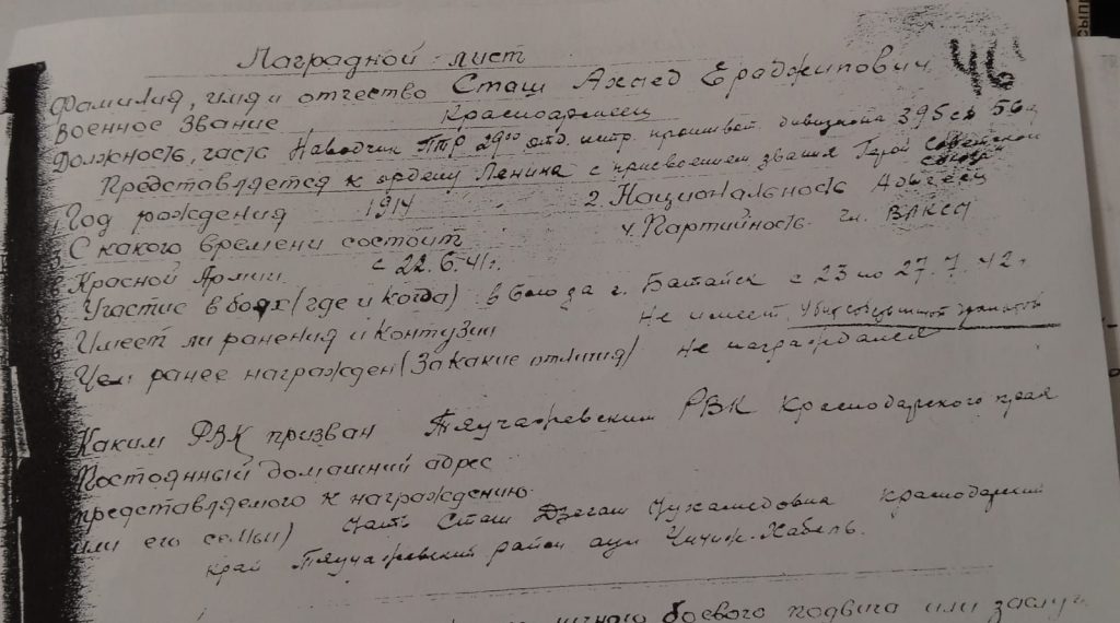 Охътэ заулэ тешIагъэу гъэзетмэ къыхаутыгъ лIыгъэ зэрахьэзэ Родинэм фэзэуагъэхэм алъэкъуацIэхэр. Ахэм ахэтыгъ бронебойщикэу СтIашъу Ахьмэд ылъэкъуацIи. Батайскэ дэжь щыкIогъэ зэошхом зыхэлажьэм лIыгъэу щызэрихьагъм осэшхо къэралыгъом фишIи, тын лъапIэ — Лениным иорден — къыфагъэшъошагъ, Советскэ Союзым и ЛIыхъужъыцIи къырапэсыгъагъ.