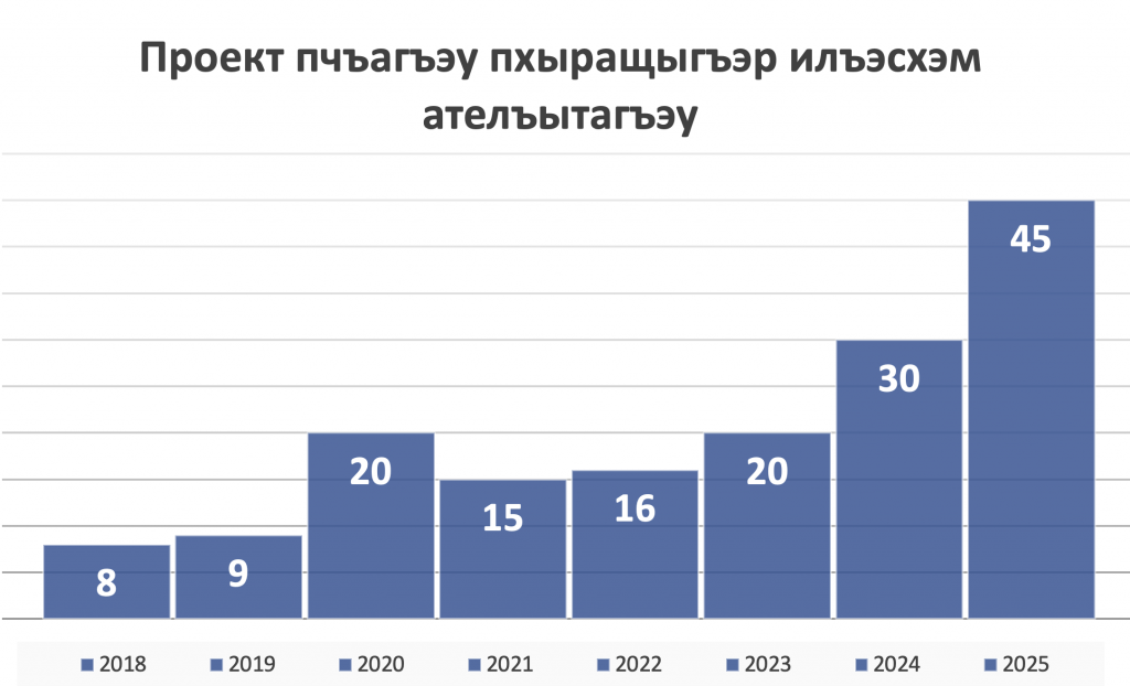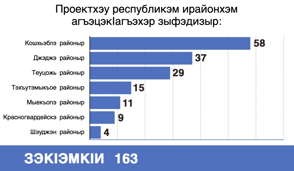 • Илъэси 8-м къыкIоцI Адыгеимпроекти 163-рэщыпхыращыгъ, анахьыбэр — 2025-рэ илъэсым: къызкIэлъэIугъэхэр 45-рэ. Мы пчъагъэр 2018-рэ илъэсым егъэпшагъэмэ, фэди 5,6-кIэ нахьыб.