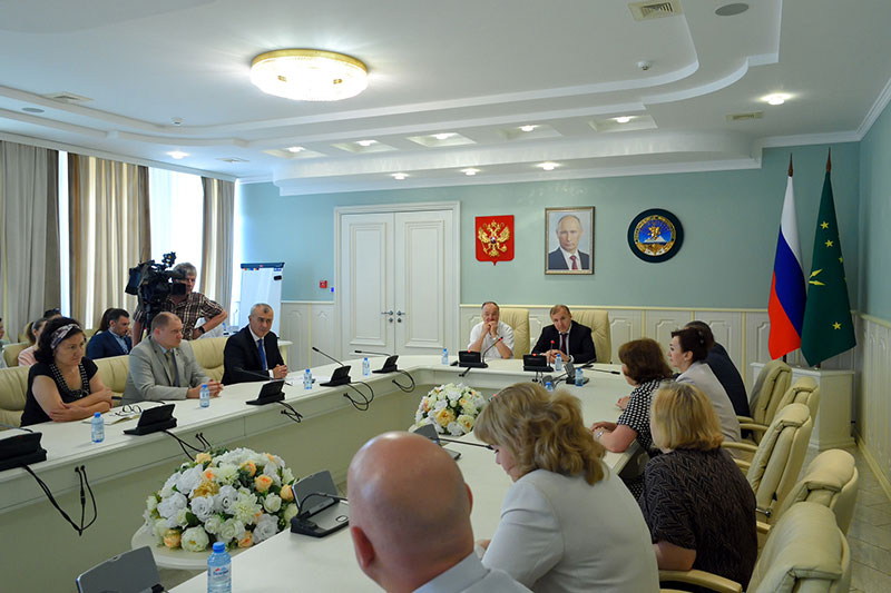 Adıgey Devlet Başkanı Kumpıl Murat ve Cumhuriyetin eski Cumhurbaşkanı Şеvmen Hazret, Adıge Cumhuriyeti Hükümet Sarayında cumhuriyetin sağlık kurumlarının idarecileri ve doktorlarıyla bir araya geldi.