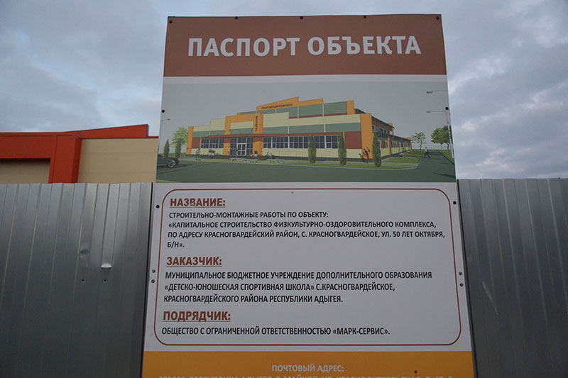 Глава Адыгеи Мурат Кумпилов проверил ход строительства физкультурно-спортивного комплекса в селе Красногвардейское. Он возводится в рамках нацпроекта «Демография».