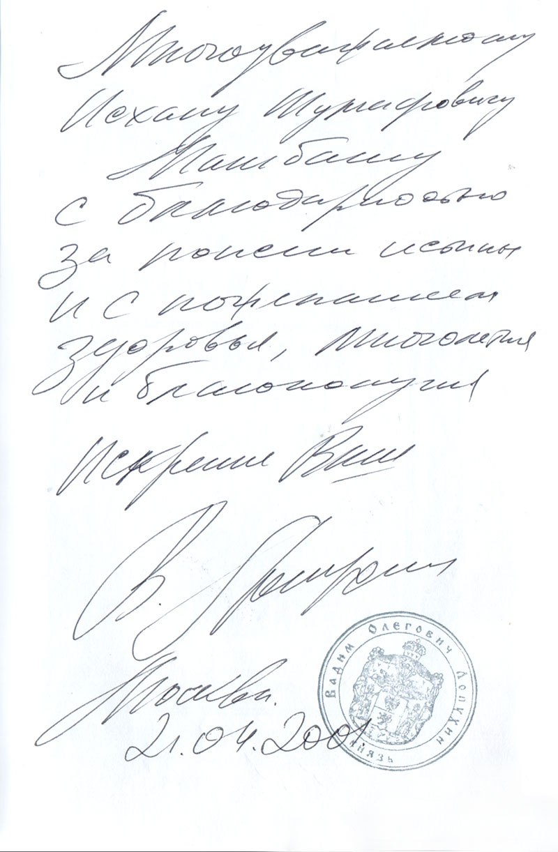 2001-рэ илъэсым имэлылъфэгъу а тхылъэу Москва къысфырагъэхыгъэм Москва илIэкъолъэш обществэ ипащэ игуадзэу Вадим Лопухиным ыIэкIэ мыхэр къысфытыритхагъэх: «Лъытэныгъэшхо зыфэсшIырэ МэщбэшIэ Исхьакъ Шумаф ыкъом шъыпкъэныгъэр ылъапсэу зэрэтхэрэм фэшI сыфэразэу есэты, псауныгъэ пытэ, щыIэкIэ-псэукIэ дэгъу иIэнэу, игъашIэ кIыхьэ хъунэу сыфэлъаIо».