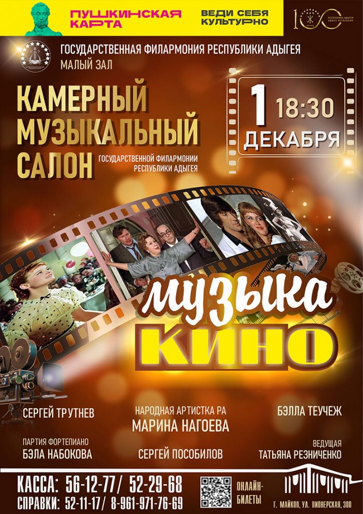 1 декабря 2022 г в 18-30 в Малом зале Государственной филармонии Республики Адыгея артисты Камерного музыкального салона ГФРА представят концертную программу «Музыка кино».