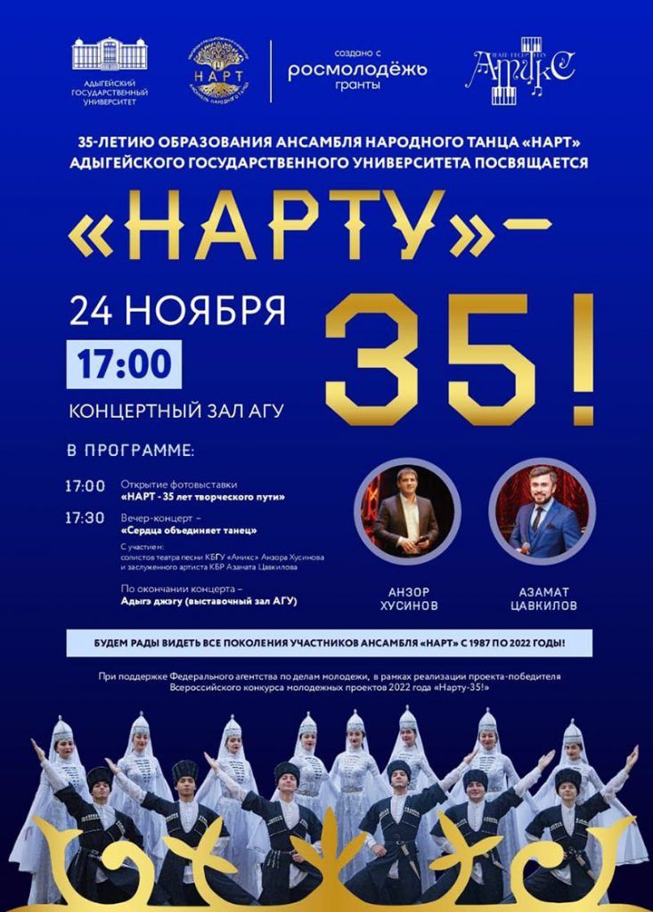 Ащ фэгъэхьыгъэ Iофтхьэбзэ гъэшIэгъон апшъэрэ еджапIэм щыкIуагъ. «Нарт — 35 лет творческого пути» зыфиIорэ сурэт техыгъэхэм якъэгъэлъэгъонкIэ ар аублагъ, ащ ыуж къекIолIагъэхэм концерт къафагъэлъэгъуагъ, адыгэ джэгукIэ Iофтхьабзэр аухыгъ.