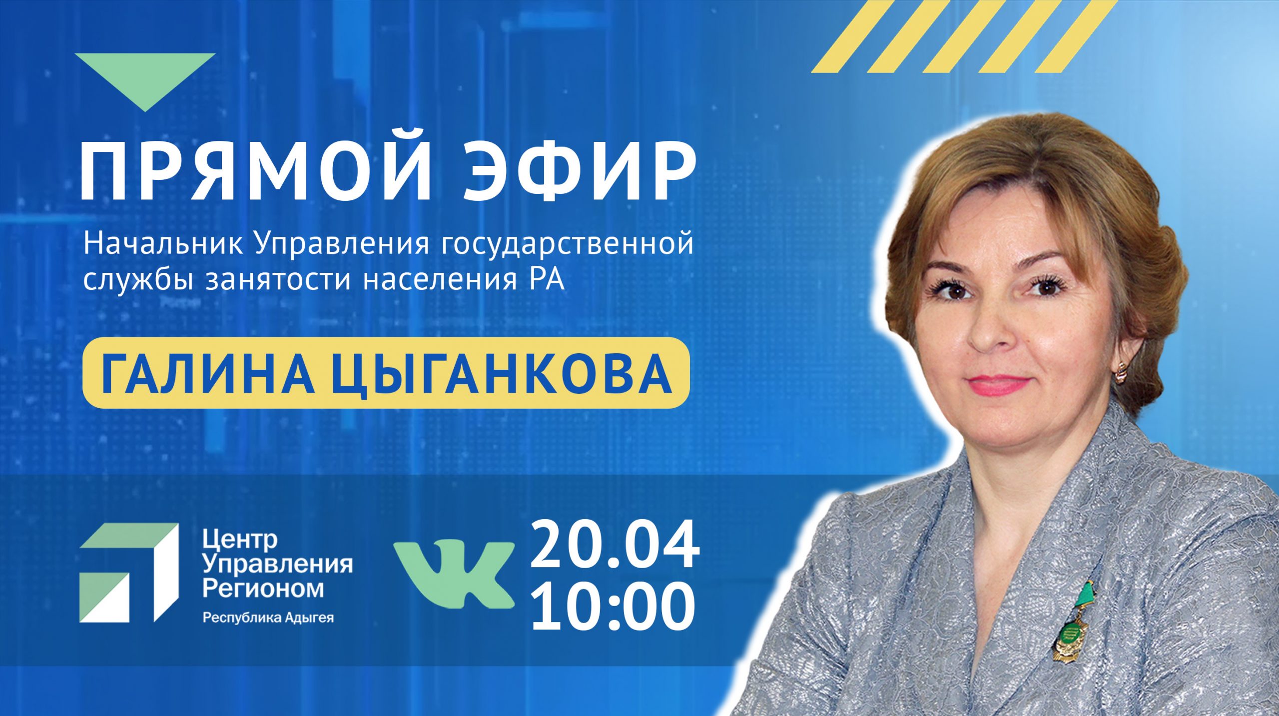 20 апреля в 10:00 начальник Управления государственной службы занятости населения РА Галина Цыганкова выйдет в прямой эфир Центра управления регионом.