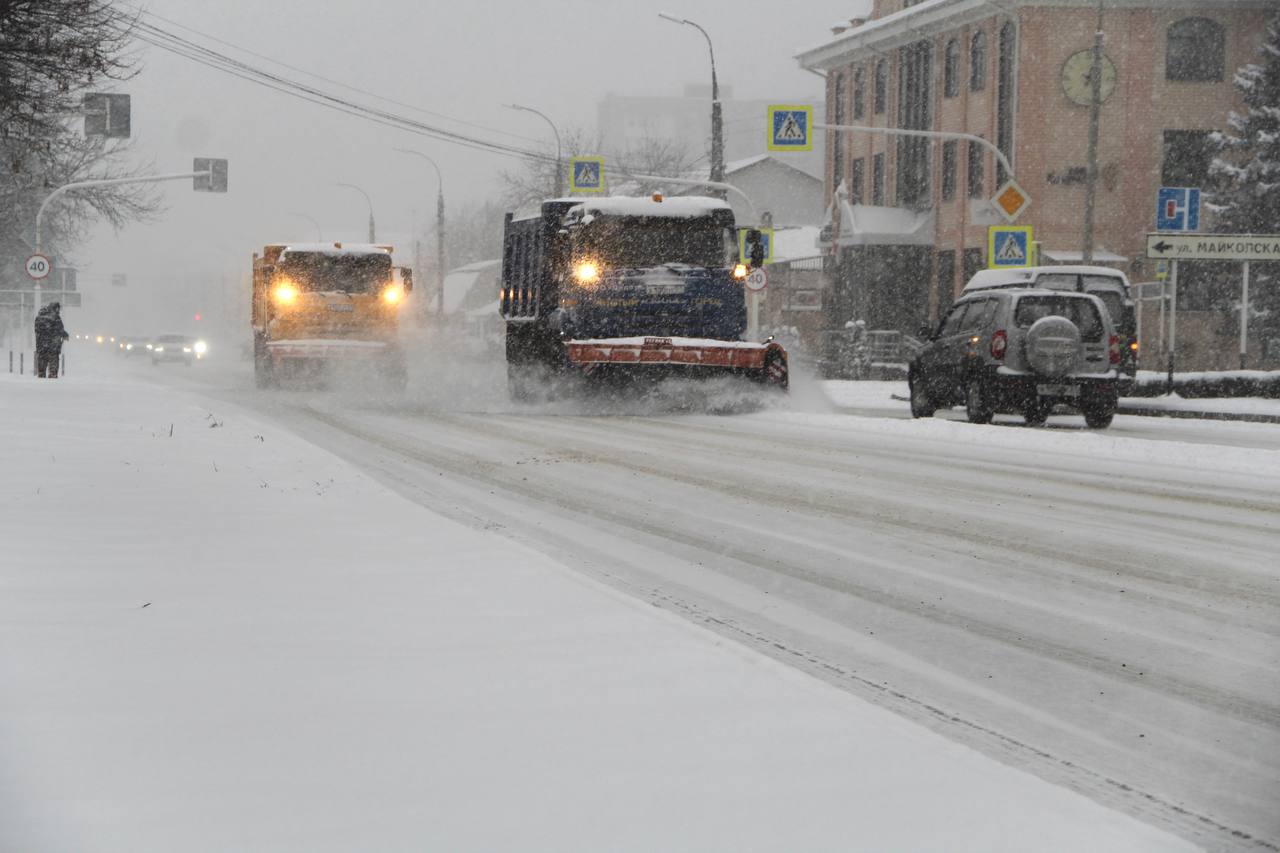 В Адыгее в связи со снегопадом коммунальные службы перешли на усиленный режим работы. В течение всего воскресного дня дороги расчищались. Для очистки города Майкопа подрядчики задействовали максимальное количество техники. В первую очередь расчищаются дороги с повышенным количеством автомобильного трафика, подходы к социально значимым объектам, пешеходная сеть, затем второстепенные автомобильные дороги и общественные территории.