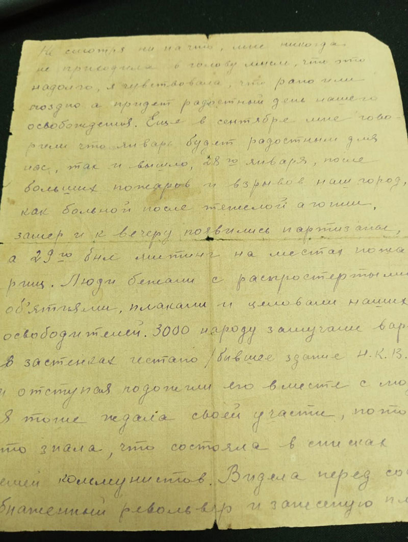«… Сятэ къалэм дэкIынэу игъо ифагъэп. Пчыхьэм Мыекъуапэ нэмыц къухьэлъатэхэр къышъхьащыбыбагъэх. Мычыжьэу топыщэ, пулемет о макъэхэр къэIухэу аублагъ. Зыгорэ къызэрэхъугъэр къэзыIопщырэ мэкъэгъэIум ибыу макъи зэпыущтыгъэп. Ащ лъыпытэу пстэури нахь къэлъэшыгъ, зэпэуцужь иныр кIощтыгъ. Сятэ сигъусэу тигъунэгъухэм адэжь зыдгъэбылъынэу тычъагъ.Чэщ реным зэпэуцужьыр кIуагъэ. Пчэдыжьым кIым-сым къэхъугъ. Урамэу Краснооктябрьскэ закъом машинэ горэхэр щызэблэкIыщтыгъэх. Щыхъурэ-щышIэрэр къызэригъэшIэнэу икIынэу зыми рихъухьэщтыгъэп. ЕтIанэ гъунэгъухэм къаIуагъ, нэмыцхэр къалэм къызэрэдэхьагъэхэр. (Нина Головко игукъэкIыжьхэр, къ. Мыекъуапэ иподпольщиц).