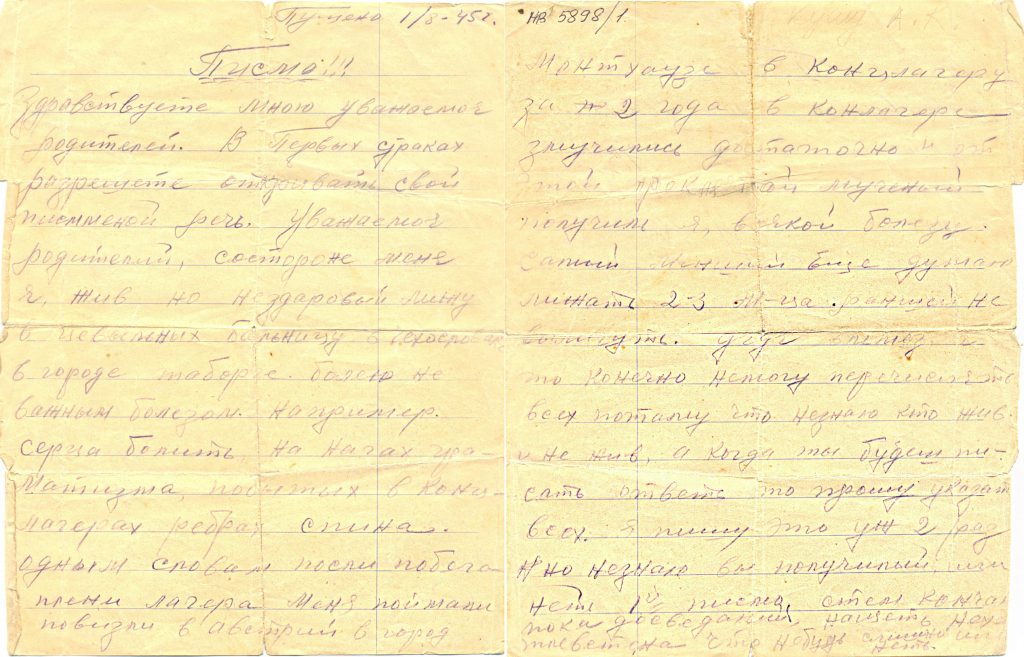 «ЗгъэлъапIэрэ ны-тыхэр, сэлам шъосэхы! СызэрэпсаумкIэ макъэ шъосэгъэIу, ау сипсауныгъэ изытет дэи, Чехословакием, къалэу Табор сымэджэщэу дэтым сычIэлъ. Уз хьылъэхэр сиIэх. ГущыIэм пае, сыгу мэузы, слъакъохэм ревматизмэр къахэхьагъ. СакIыб, сцагэхэр концлагерым сычIэсыфэ зэхаутыгъэх. ИлъэситIум концлагерым къиныбэ щыслъэгъугъ ыкIи ахэм узхэр ахэсхыгъэх. Мэзэ зытIущ горэм джыри сымэджэщым сычIэлъыщтын фае, нахьыжьэу сыкъычIагъэкIыщтэп. Сызхэтыгъэхэм ащыщэу псаоу къэнагъи, щымыIэжьи къэсIонэу сшIэрэп. ЯтIонэрэу мыр къэсэтхы, ситхыгъэхэр къыжъунэсыхэми сшIэрэп».