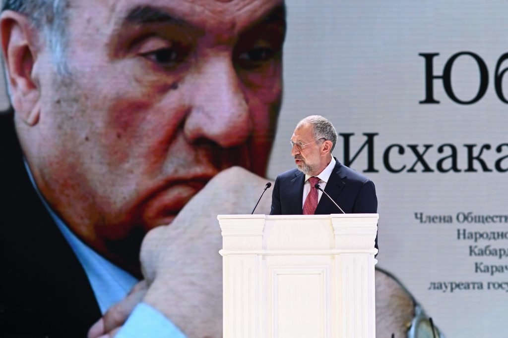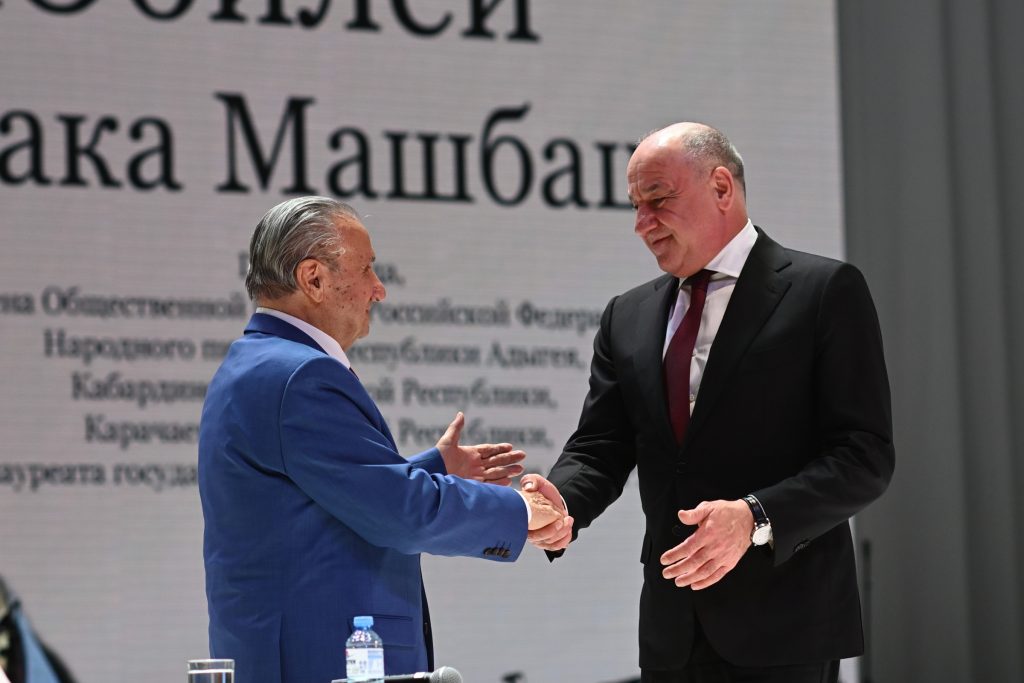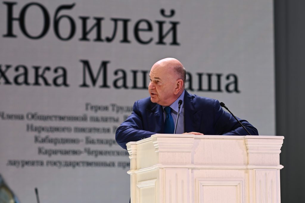 Урысыем IофшIэнымкIэ и ЛIыхъужъэу, УФ-м и Общественнэ палатэ хэтэу, Адыгеим, Къэбэртэе-Бэлъкъарым, Къэрэщэе-Щэрджэсым янароднэ тхакIоу МэщбэшIэ Исхьакъ Шумафэ ыкъом ыныбжь 95-рэ зэрэхъугъэм фэгъэхьыгъэ мэфэкI зэIукIэр концерт залэу «Налмэсым» щыкIуагъ.