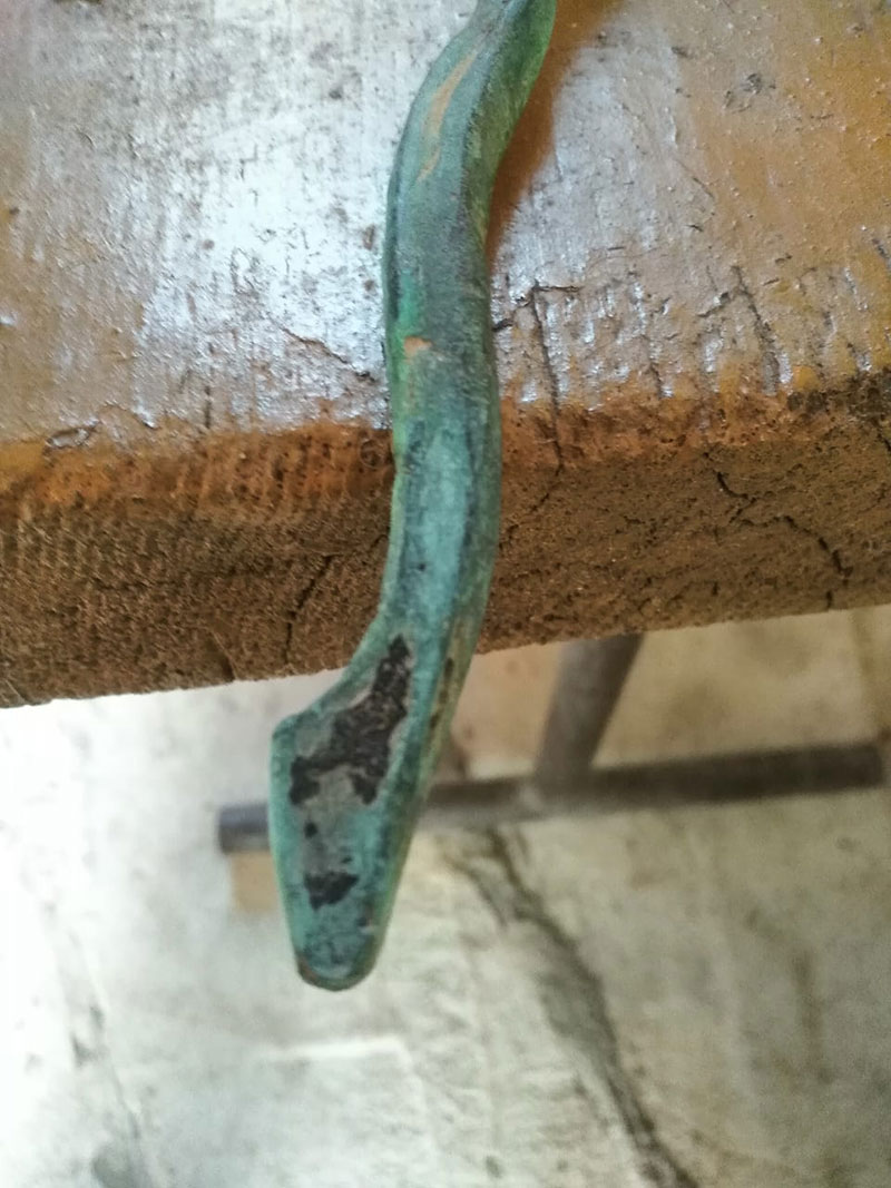 Pirinçten bu nesne yılan gibi. Uçları yılan başı gibi. Bir ucu daha iri, diğer ucu ise gözle görünür şekilde daha ince.