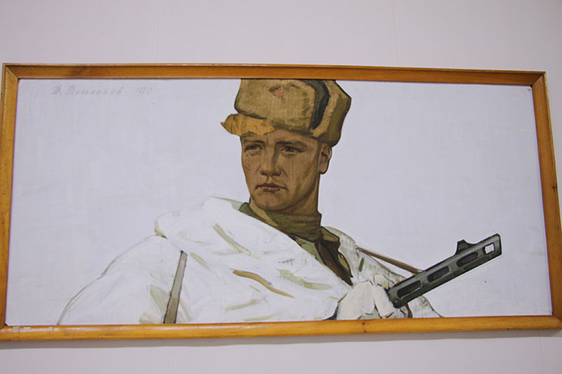 Иван Лазаренкэр разведчик лIыхъужъэу щытыгъ. Ащ исурэт Д. Мельниковым ышIыгъ. ДзэкIолIыр нэгушIу, уIэшыгъэу къыоплъы.