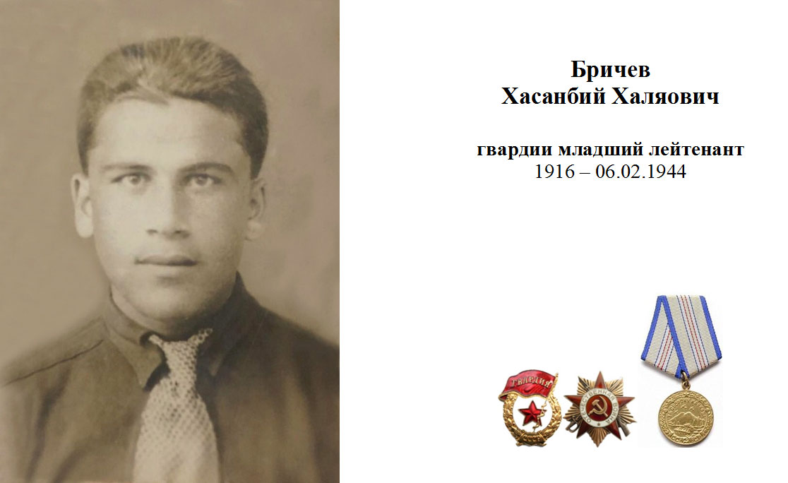 Приказом главного управления кадров НКО СССР от 12 мая 1944 года №01616, командир взвода 45-го гвардейского Донского казачьего кавалерийского полка младший лейтенант Бричев Хасанбий Халяович исключён из списков Красной Армии как умерший от ран, полученных в боях против немецко-фашистских войск, 6 февраля 1944 года.