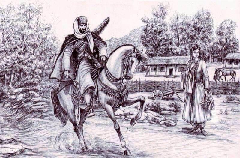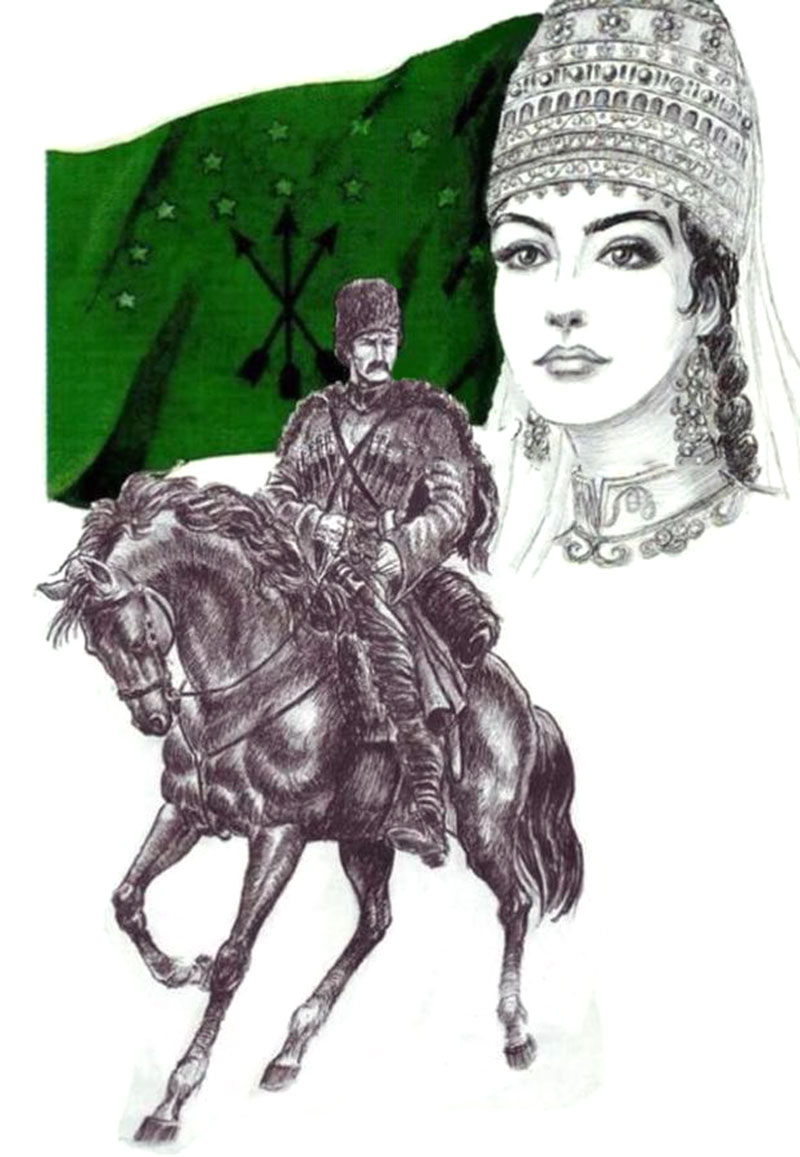 «А какой цвет, как художник, ты любишь больше всего?» - этот вопрос я всегда задаю художникам. Мухадин Кишев - кабардинский художник, живущий в Испании, говорил, что у художника не может быть любимого цвета. Сегодня – это один, завтра – другой. Каждой работе подбираются свои цвета. Айтек отвечает: «Любимый цвет – дело настроения. Вообще тяготею к черному и белому. В художественном искусстве – это пятна. Черкесская историческая тема тоже в моем творчестве выполнена в графике, исторической хронике подходит этот стиль. Синий и оранжевый, их сочетание очень подходит друг другу, как у Ван Гога». Графика и яркие сочетания цветов - про себя отмечаю я, и тут же вспоминаю его фотографии с путешествий, которые он выкладывает на своих страницах: яркие желтые, оранжевые домики, на фоне синего моря южных городов Европы или величественных гор европейской альпики. Он – всегда в центре, с растянутым зеленым полотнищем, с 12-тью желтыми звездами и тремя стрелами, копьями вверх, – более жизнеутверждающего флага нет ни у одного народа в мире. Все сходится – любимые цвета, философия души и окружающий мир – вот она настоящая космическая гармония. Не каждому художнику такое дано.