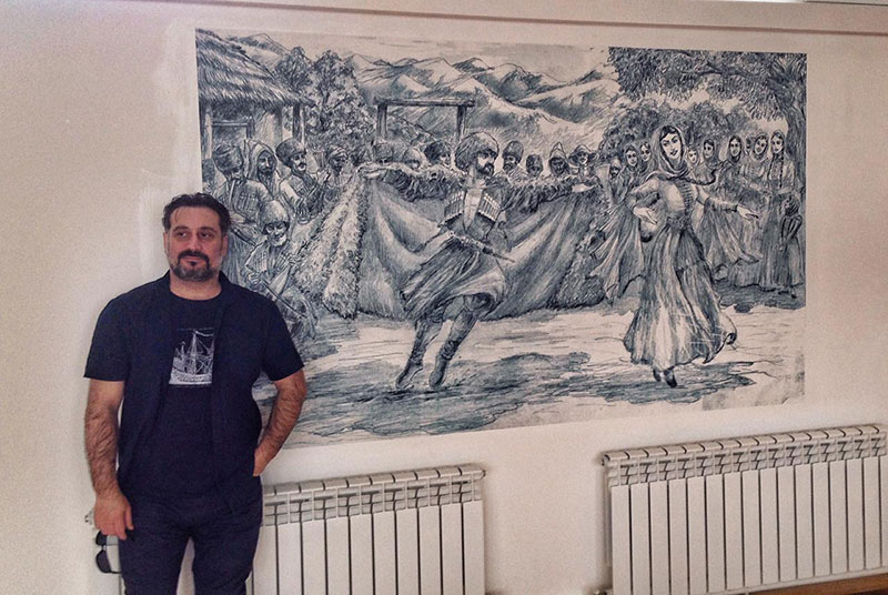 «А какой цвет, как художник, ты любишь больше всего?» - этот вопрос я всегда задаю художникам. Мухадин Кишев - кабардинский художник, живущий в Испании, говорил, что у художника не может быть любимого цвета. Сегодня – это один, завтра – другой. Каждой работе подбираются свои цвета. Айтек отвечает: «Любимый цвет – дело настроения. Вообще тяготею к черному и белому. В художественном искусстве – это пятна. Черкесская историческая тема тоже в моем творчестве выполнена в графике, исторической хронике подходит этот стиль. Синий и оранжевый, их сочетание очень подходит друг другу, как у Ван Гога». Графика и яркие сочетания цветов - про себя отмечаю я, и тут же вспоминаю его фотографии с путешествий, которые он выкладывает на своих страницах: яркие желтые, оранжевые домики, на фоне синего моря южных городов Европы или величественных гор европейской альпики. Он – всегда в центре, с растянутым зеленым полотнищем, с 12-тью желтыми звездами и тремя стрелами, копьями вверх, – более жизнеутверждающего флага нет ни у одного народа в мире. Все сходится – любимые цвета, философия души и окружающий мир – вот она настоящая космическая гармония. Не каждому художнику такое дано.