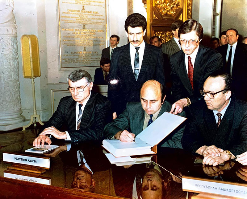 А.Хъ. ЛIыIужъумрэ Адыгэ Республикэм иапэрэ Президентэу А.А. Джарымэмрэ 1993-рэ илъэсым Москва аIапэ щыкIадзэжьыгъагъ хабзэм ифедеральнэ къулыкъухэмрэ федерацием исубъектхэмрэ яполномочиехэр зэтеутыгъэнхэм ехьылIэгъэ Федеративнэ Зэзэгъыныгъэм. 1995-рэ илъэсым гъэтхапэм и 10-м Адыгэ Республикэм и Конституцие аштэгъагъ.